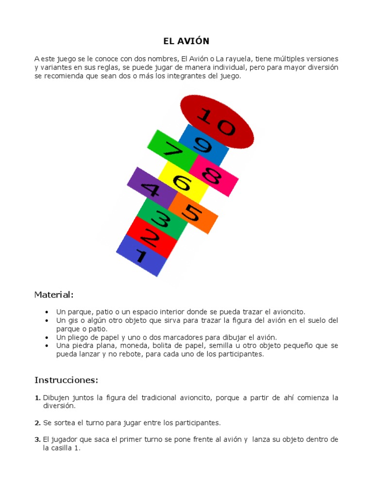 Será la cancha se pintan cuadros que avanzan de uno en uno. Como se juega al avioncito Para jugar avión cada jugador debe tener su teja algunos niños hacen su teja con una bola de papel absorbente mojado ésta facilita que se pegue al piso de la casilla cuando se lanza. Los niños están por salir de la escuela y el reto de entretenerlos es mayor. Para jugar al Avioncito o Rayuela se necesita una tiza un espacio plano como el piso del patio de la. Cualquier niño de México o el resto del mundo que tenga a la mano una tiza una superficie plana en el suelo y unas cuantas piedritas puede poner en práctica este juego tradicional ya sea de forma individual o grupalmente. Además es una forma muy divertida de realizar actividad física y aprender los números. Aprendiendo y Jugando.